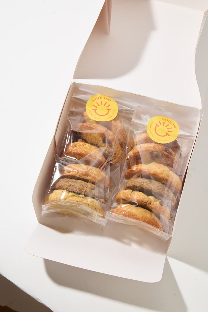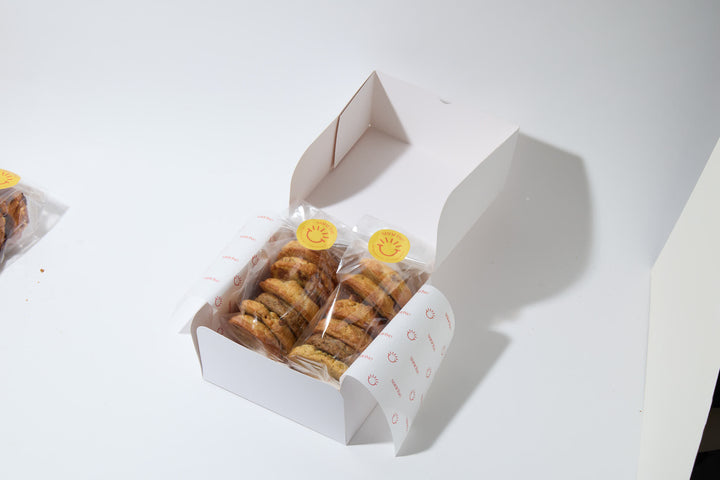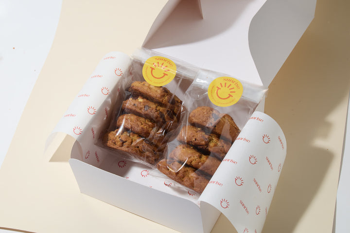 Las cookies de Sunrise llegan a casa frescas, recién hechas, crujientes por fuera y suaves por dentro, con un envoltorio precioso que las hace perfectas para regalar o disfrutar al momento